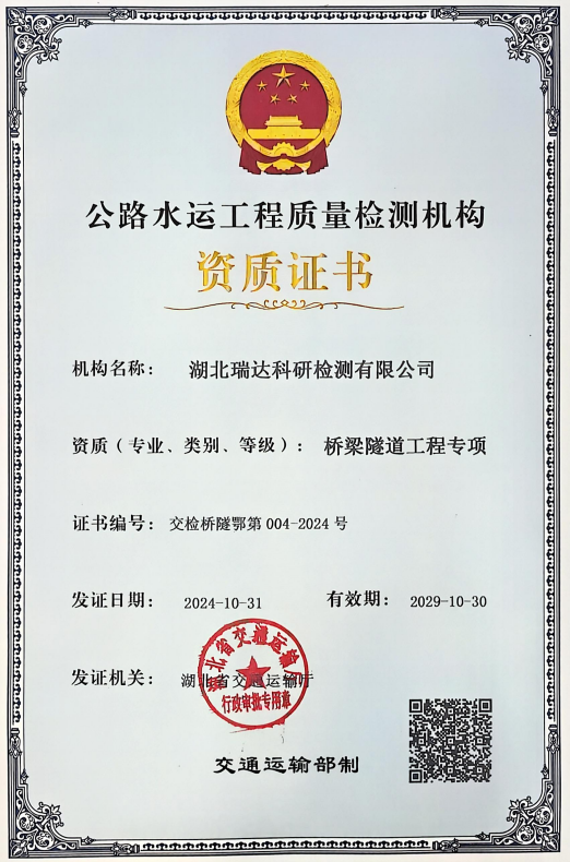 爭創一流|湖北路橋瑞達科研檢測公司成功取得公路工程橋梁隧道工程專項資質