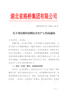汛情就是命令,責任重于泰山。湖北路橋迅速發布《關于切實做好汛期安全生產工作的通知》《關于切實做好夏季汛期和高溫季節安全生產工作的通知》,安排部署加強汛期安全防范工作。各分子公司、各項目積極響應,按照“三管三必須”要求,抓好汛期安全風險防控工作,嚴格落實安全生產責任,狠抓安全防范措施落實,堅決筑牢防汛“安全堤”。全體員工繃緊防汛這根弦,堅決克服麻痹、僥幸心理,以“時時放心不下”的責任感,落細落實各項防汛措施,確保安全度汛。